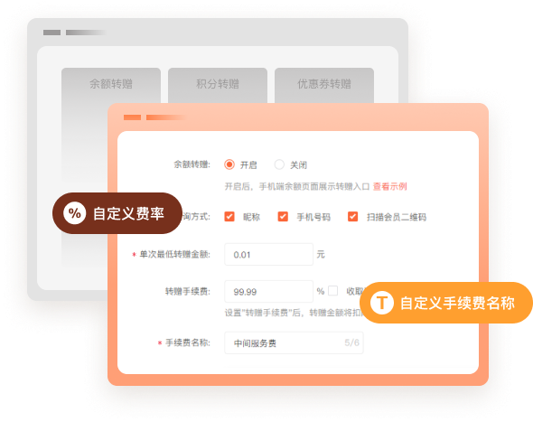 可根据需求自定义手续费的名称和费率,会员转赠资产时,系统将自动扣除手续费后转赠给受赠人账户。
