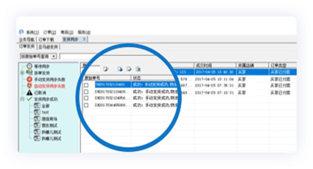 网店管家软件可同步发货订单的原始单号、成交时间、订单类型、发货时间、收件人、发货单号及发货方式